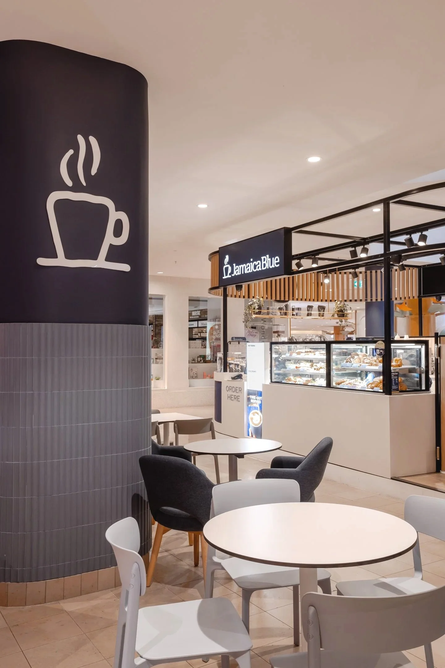 Jamaica Blue’s store design has evolved with the brand’s objectives, appealing to a wider customer base. This has been executed through contemporary colours tones and architectural elements, and the ability to adapt to various formats – from large dine in spaces, to kiosk sites and espresso bars. The internal layout has also been re-invigorated to balance aesthetics with operational efficiency.