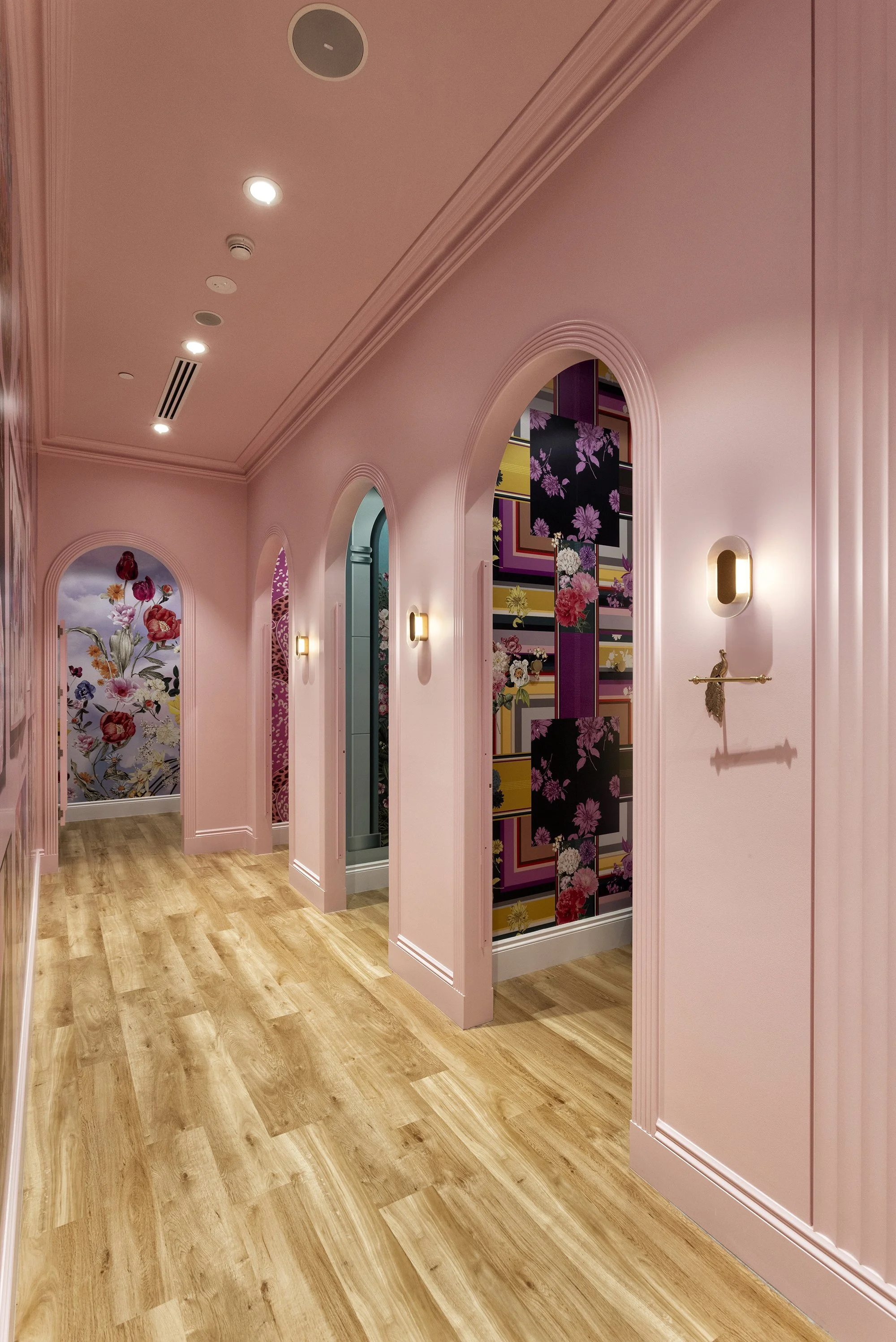The fitting rooms were designed as an immersive experience, enveloped in pink from walls, including fitting room doors to ceiling. Combined with unique custom Peter Alexander wallpapers, this design created a sense of stepping into a vibrant, whimsical world that perfectly encapsulates the brand’s character.