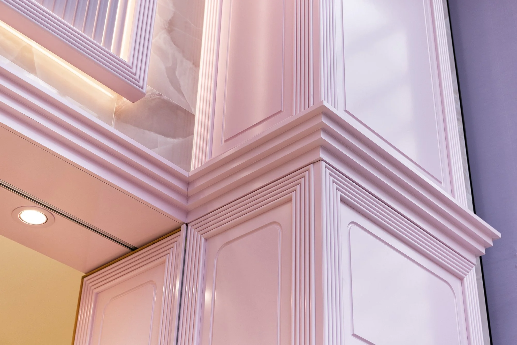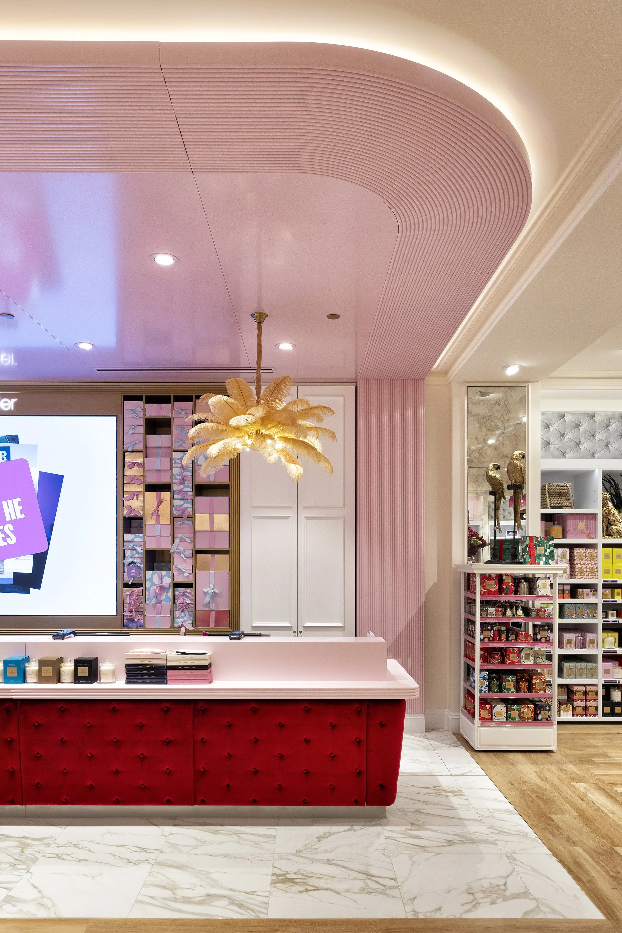 At the heart of the store, the counter was highlighted by a bold, solid pink feature ceiling. Curved edges and modern mouldings softened the space, creating a striking yet harmonious centrepiece. Behind the counter, a digital screen was integrated into the rear wall, flanked by gift box shelves on either side.